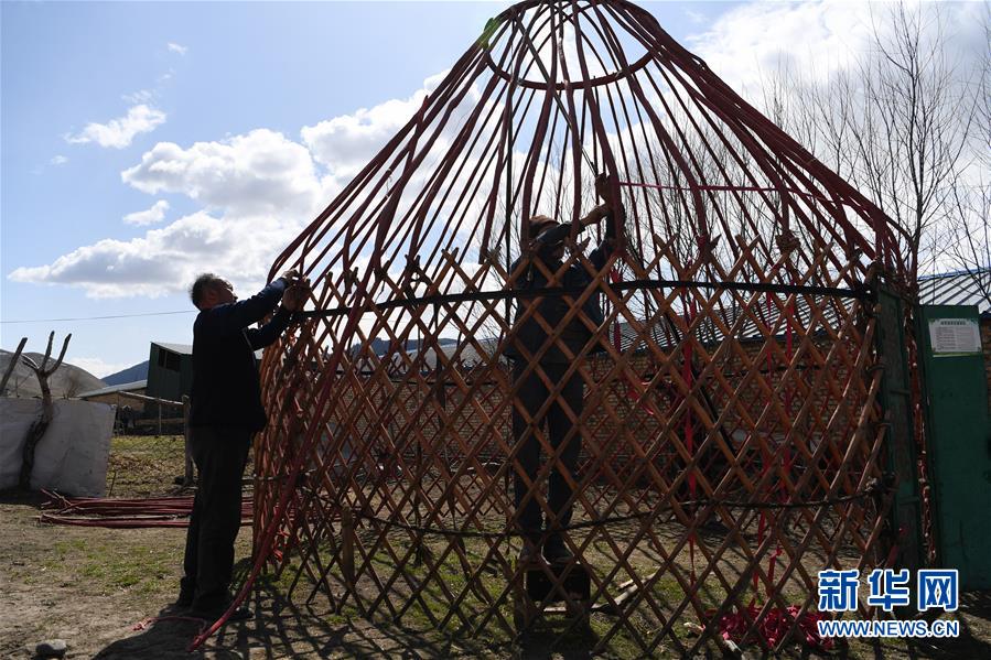 4月5日,在新疆新源县那拉提镇阿尔善村,海依那尔的家人在搭建毡房的骨架。哈萨克族被称为“马背上的民族”。游牧时代,毡房因易于拆装且便携,成为哈萨克族牧民“移动的家”。 近年来,随着新疆一系列牧民定居工程的实施,越来越多的牧民住进定居点,毡房也悄悄完成“变身”。新华社记者 宋彦桦 摄