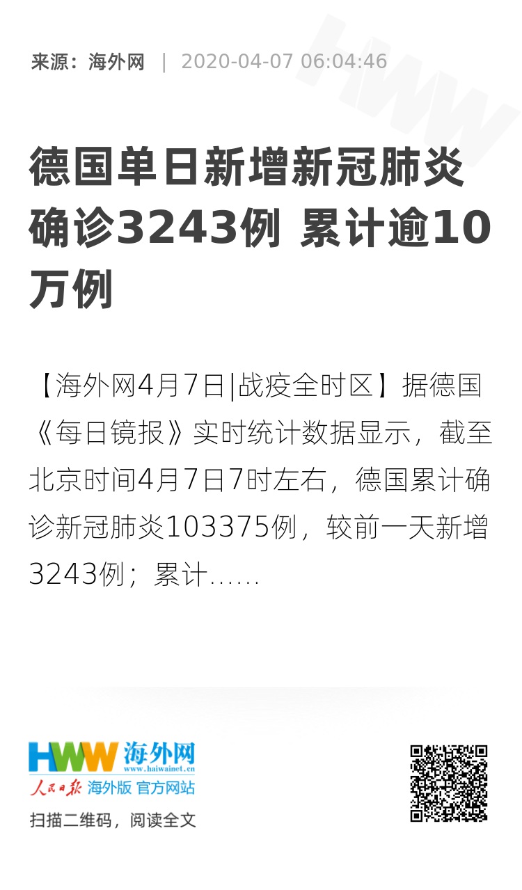 【海外网4月7日|战疫全时区】据德国《每日镜报》实时统计数据显示,截至北京时间4月7日7时左右,德国累计确诊新冠肺炎103375例,较前一天新增3243例;累计死亡1810例,较前一天新增226例;累计治愈28700人。