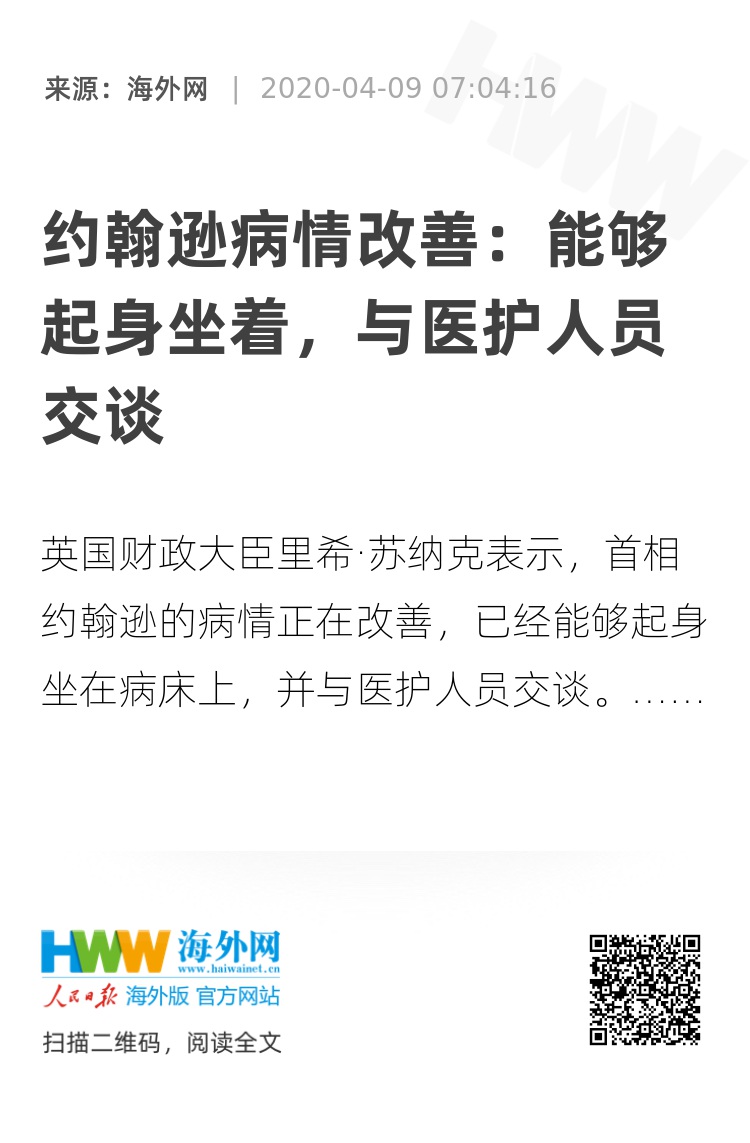【海外网4月9日|战疫全时区】据路透社报道,英国财政大臣里希·苏纳克周三(8日)表示,首相约翰逊目前正在重症监护室与病魔做斗争,不过他的病情正在改善,已经能够起身坐在病床上,并与医护人员交谈。
