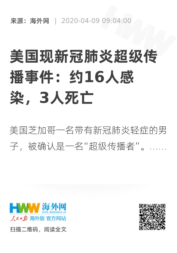 【海外网4月9日|战疫全时区】当地时间8日,美国疾病控制与预防中心公布一项调查,内容称芝加哥一名带有新冠肺炎轻症的男子是一名“超级传播者”。