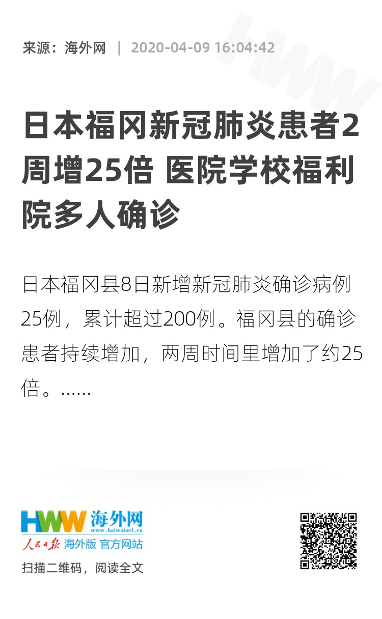 【海外网4月9日|战疫全时区】日本福冈县8日新增新冠肺炎确诊病例25例,累计超过200例。福冈县的确诊患者持续增加,两周时间里增加了约25倍。