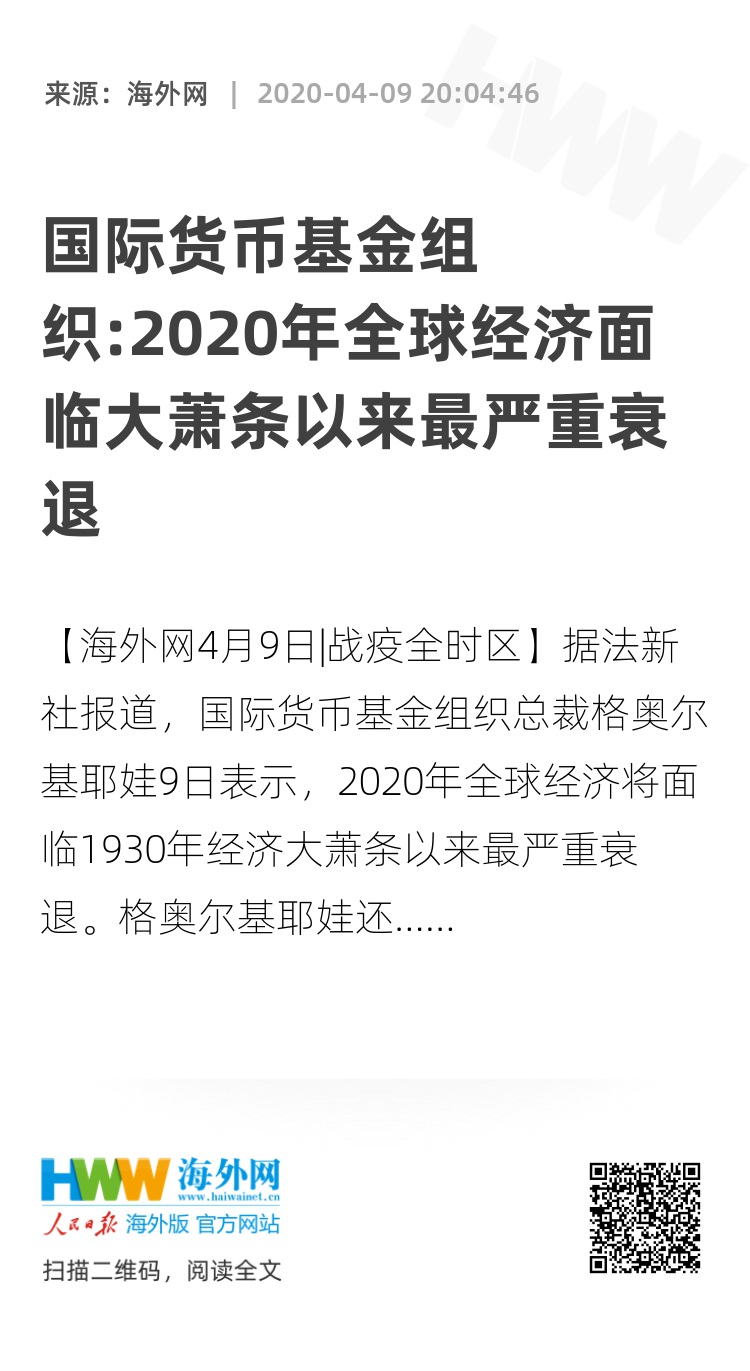 【海外网4月9日|战疫全时区】据法新社报道,国际货币基金组织总裁格奥尔基耶娃9日表示,2020年全球经济将面临1930年经济大萧条以来最严重衰退。格奥尔基耶娃还称,170个成员国的人均收入将因新冠肺炎疫情影响而减少。