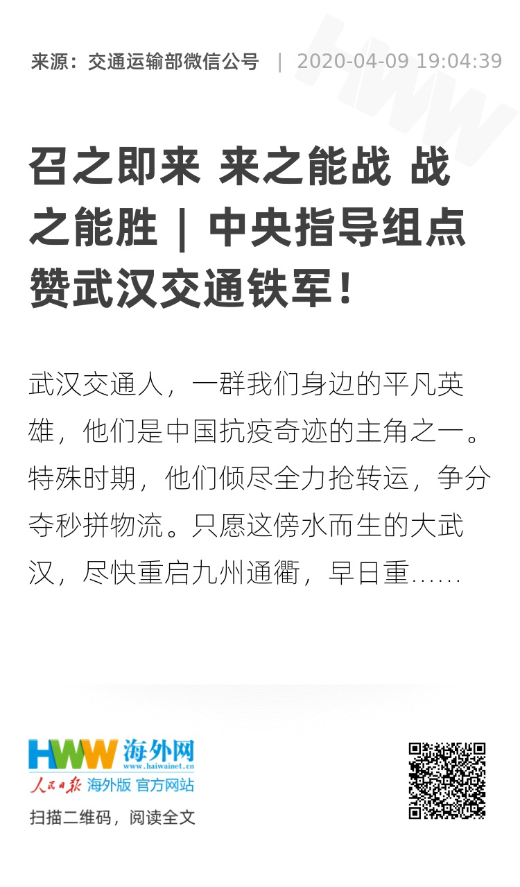 31763764,.召之即来 来之能战 战之能胜 | 中央指导组点赞武汉交通铁军!,.2020-04-09 19:31:39,.204466,.俞镜淇