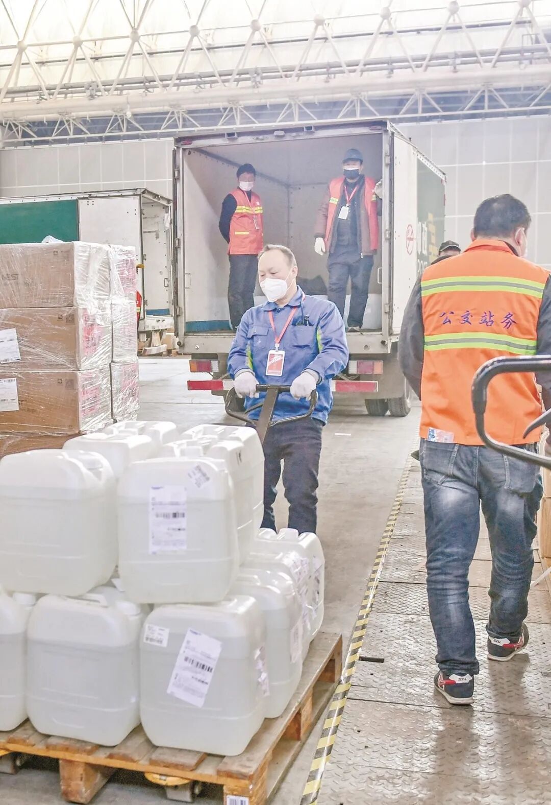 武汉疫情吃紧的时候,全国各地的爱心、物资如潮水般向江城涌来。为了让这些物资能够顺利且快速地到达武汉,武汉市交通运输局积极争取武汉铁路部门支持,开辟应急运输“绿色通道”,及时将支援物资通过全国铁路干线运抵武汉。截至4月2日,铁路共运输物资7.11万吨。水路方面,在长江海事局、武汉海事局及武汉港等港口的支持下,通过水路运输的钢铁、煤矿等大宗物资运输得到保证,武汉水电油气等基本行业也实现了正常运转。截至4月2日,水路共运输物资637.14万吨。物资从外地到了武汉的火车站、港口,还得尽快地转运到位。由此,一个公路运输应急网形成。武汉市交通运输局构建了以国博中心仓库及宝湾、捷利、萃元物流园为主体的“1+3”防疫物资储运分拨平台,实现应急物资高效转运分拨。2月2日以来,国博中心共转运分拨27.8万件、约1万吨医疗类物资;三大中转站转运物资5275.72吨,其中医疗类物资789.1吨,生活类物资4549.4吨。为保障“应收尽收”的工作快速推进,共投入200台货运车、公交车辆支援火神山、雷神山及方舱医院建设物资运输,共运输3460台次,运送物资4526 吨、10.6万件。
