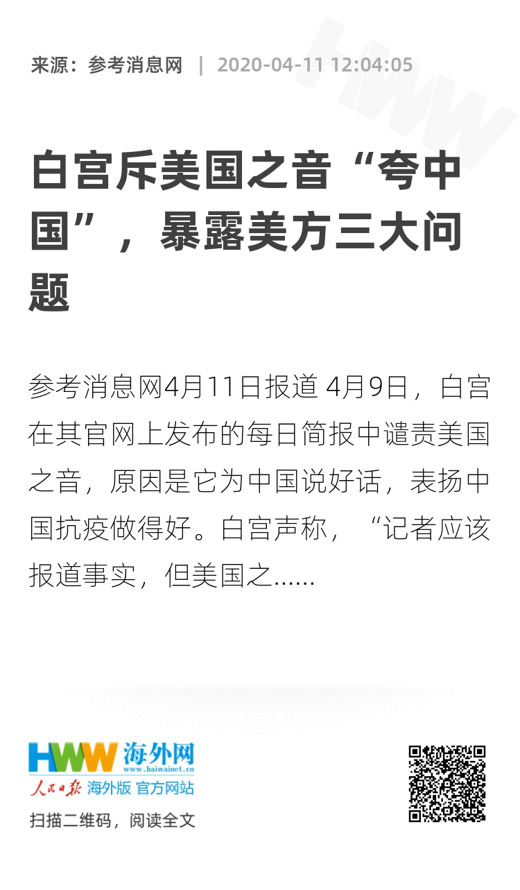 参考消息网4月11日报道 4月9日,白宫在其官网上发布的每日简报中谴责美国之音,原因是它为中国说好话,表扬中国抗疫做得好。白宫声称,“记者应该报道事实,但美国之音却助力北京做宣传”。