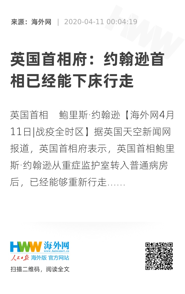 【海外网4月11日|战疫全时区】据英国天空新闻网报道,英国首相府表示,英国首相鲍里斯·约翰逊从重症监护室转入普通病房后,已经能够重新行走。英国首相府在一份声明中透露,首相已经能够在休息期间进行短时间的散步,这是他康复护理的一部分。