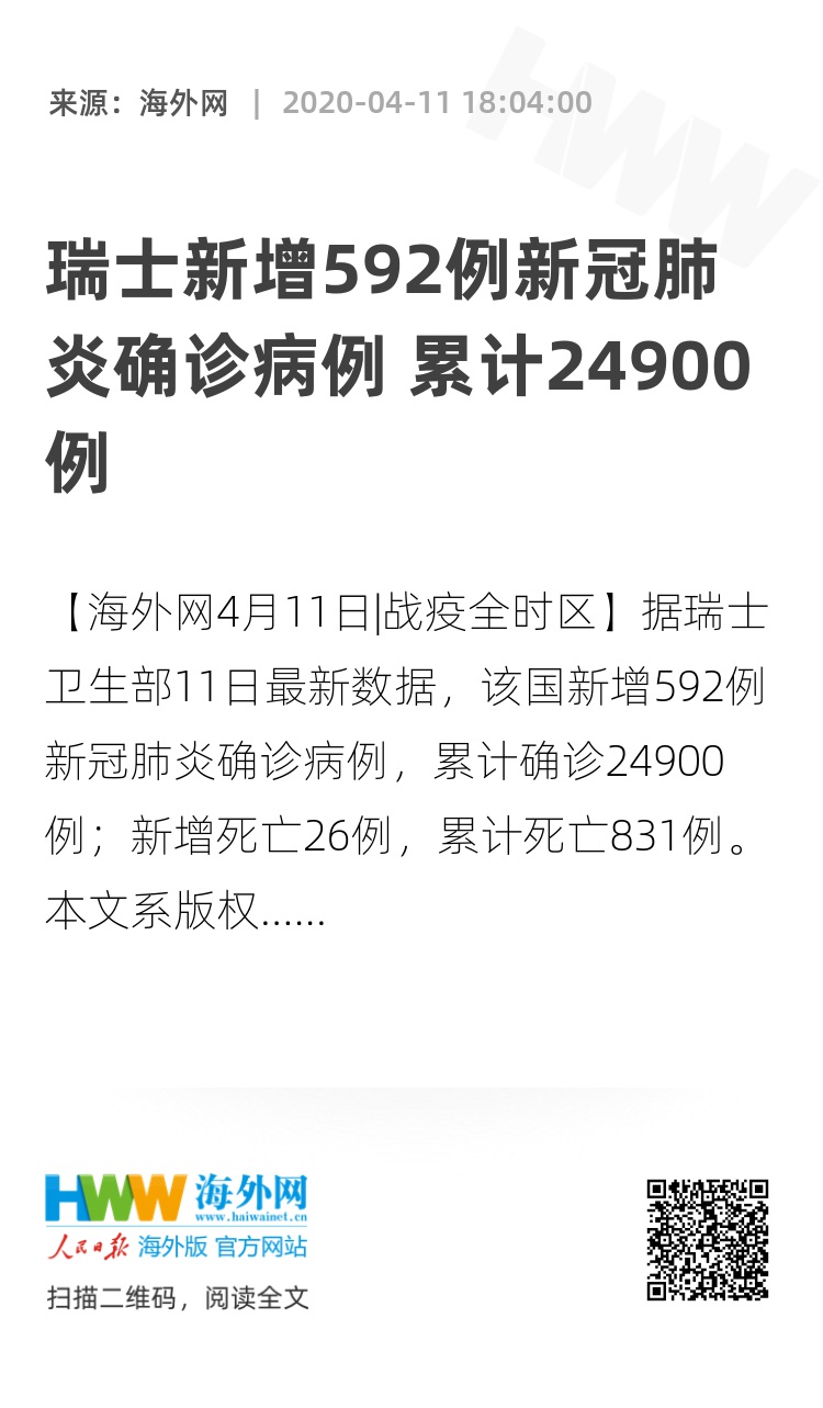 【海外网4月11日|战疫全时区】据瑞士卫生部11日最新数据,该国新增592例新冠肺炎确诊病例,累计确诊24900例;新增死亡26例,累计死亡831例。