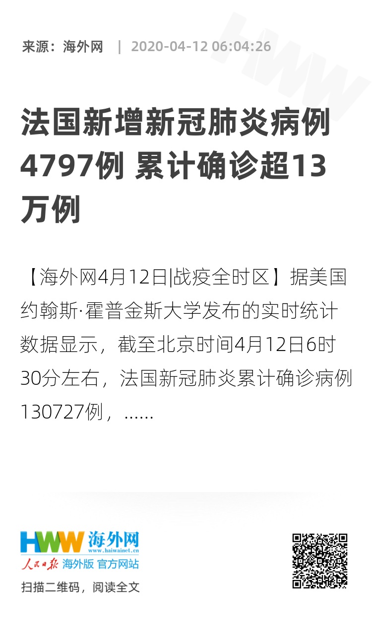 【海外网4月12日|战疫全时区】据美国约翰斯·霍普金斯大学发布的实时统计数据显示,截至北京时间4月12日6时30分左右,法国新冠肺炎累计确诊病例130727例,累计死亡病例13851例;与前一天6时30分数据相比,法国新增确诊病例4797例,新增死亡636例。(海外网 张敏)