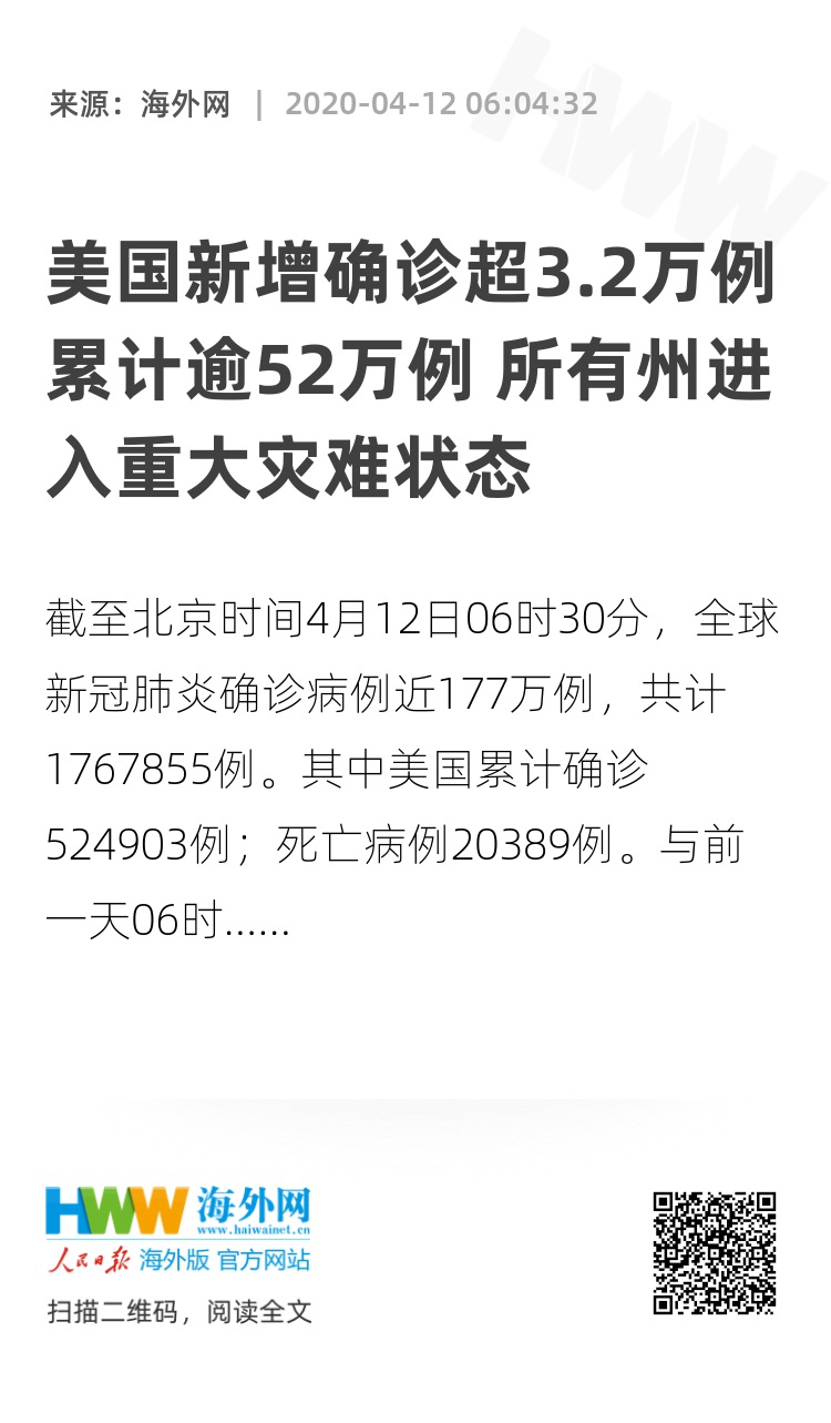 【海外网4月12日|战疫全时区】约翰斯·霍普金斯大学新冠肺炎疫情统计数据显示,截至北京时间4月12日06时30分,全球新冠肺炎确诊病例近177万例,共计1767855例。其中美国累计确诊524903例;死亡病例20389例。与前一天06时30分数据相比,美国新增确诊病例32663例;新增死亡病例2039例;康复人数31066人。