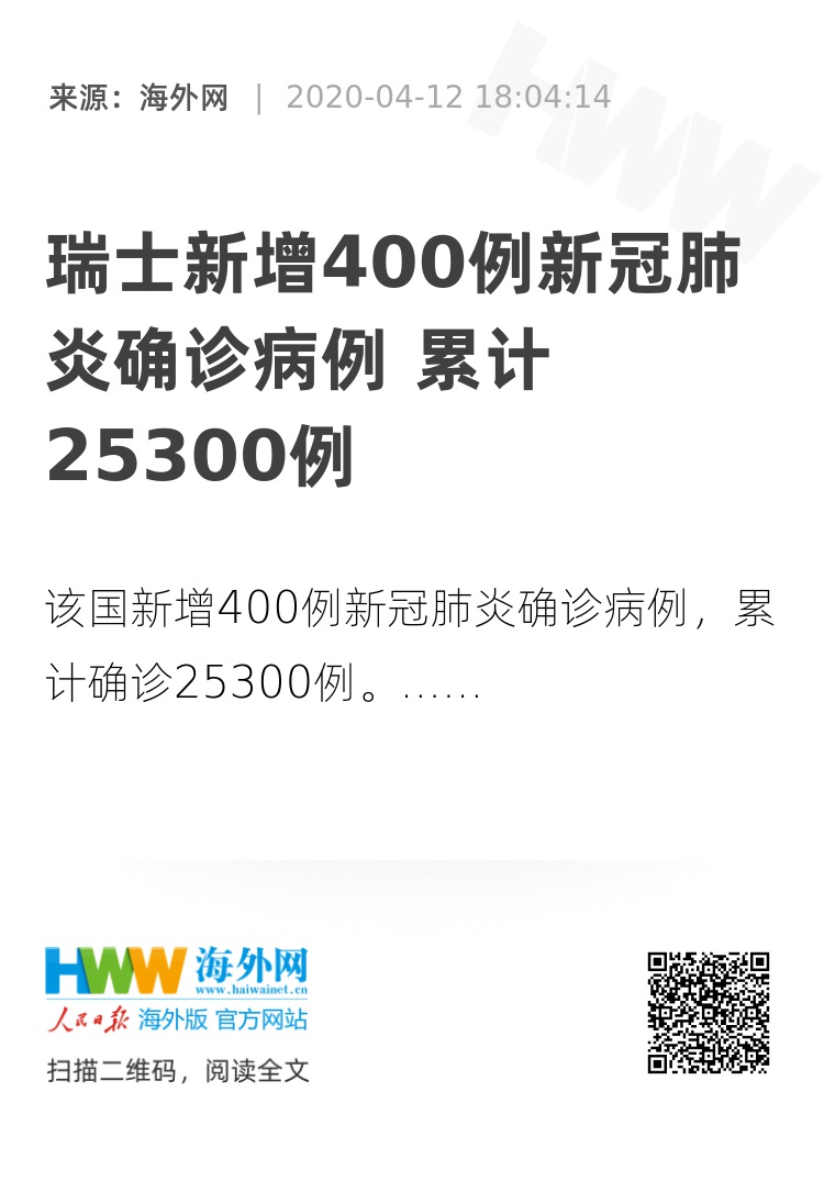 【海外网4月12日|战疫全时区】据瑞士卫生部12日最新数据,该国新增400例新冠肺炎确诊病例,累计确诊25300例;新增死亡27例,累计死亡858例。(海外网 赵健行)