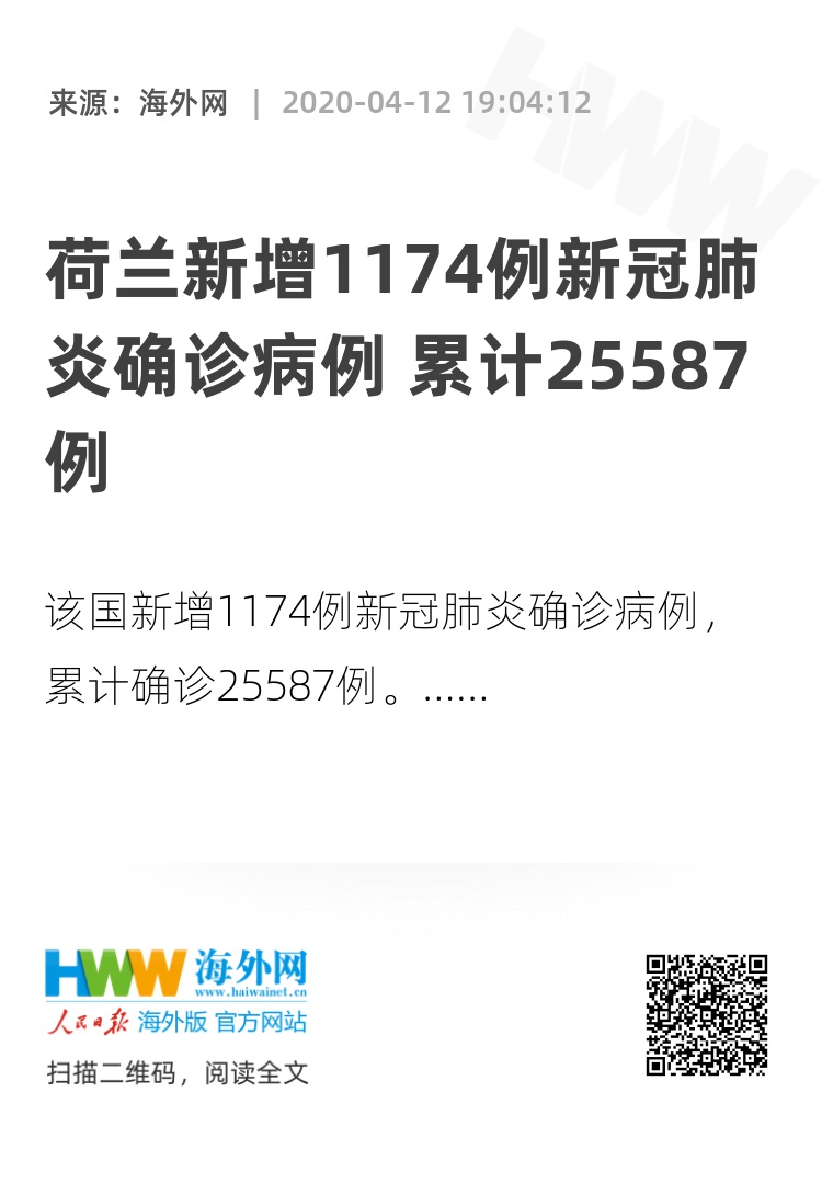 【海外网4月12日|战疫全时区】据荷兰卫生部官网12日最新数据,过去24小时,该国新增1174例新冠肺炎确诊病例,累计确诊25587例;死亡病例新增94例,累计2737例。
