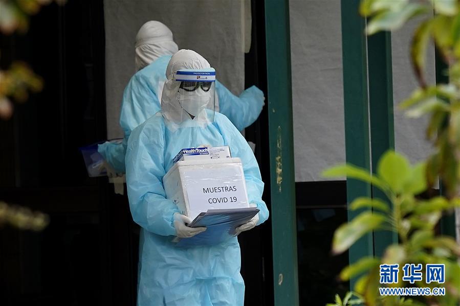 4月12日,在智利首都圣地亚哥,医务人员拿着装有新冠病毒检测样本的盒子走出出现聚集性疫情的养老院。 近日,智利首都圣地亚哥一养老院出现聚集性疫情。 新华社/智利一号通讯社