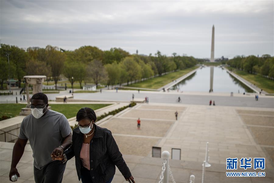 4月12日,在美国首都华盛顿,人们戴着口罩登上林肯纪念堂台阶。 美国约翰斯·霍普金斯大学12日发布的新冠疫情最新统计数据显示,美国确诊病例超过55万例,是全球确诊病例最多的国家。 新华社发(沈霆 摄)