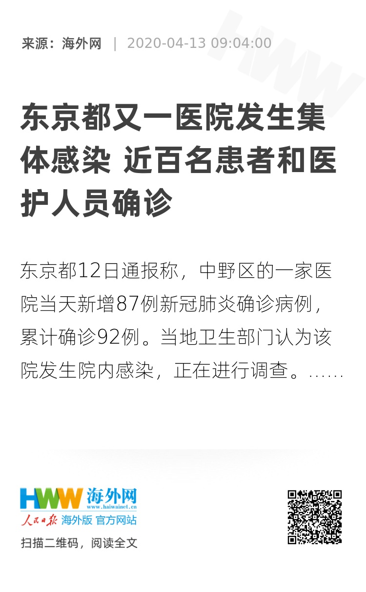 【海外网4月13日|战疫全时区】据日本《每日新闻》13日报道,东京都12日通报称,中野区的一家医院当天新增87例新冠肺炎确诊病例,累计确诊92例。此前,台东区的一家医院累计确诊163例,累计死亡20例。