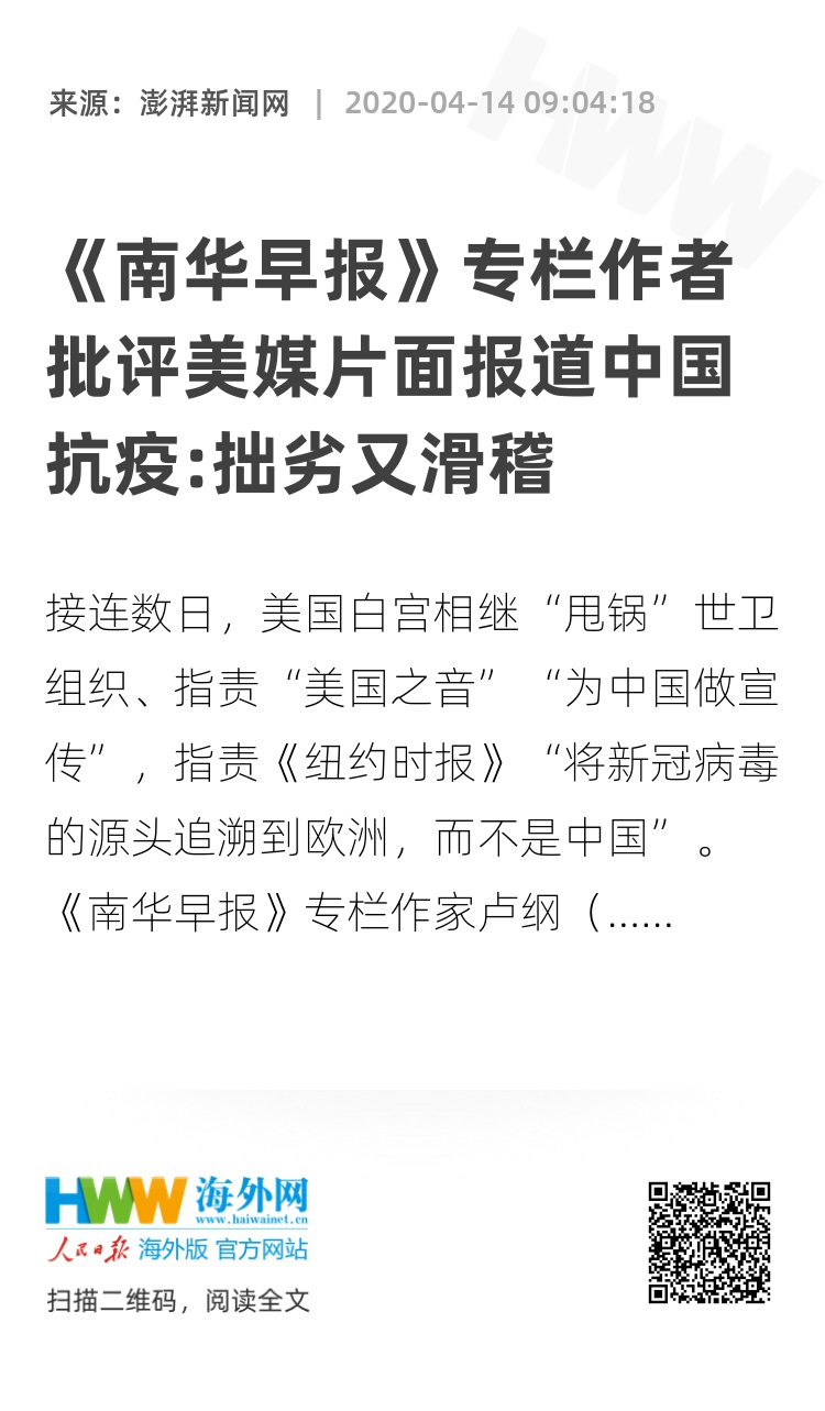 接连数日,美国白宫相继“甩锅”世卫组织、指责“美国之音”“为中国做宣传”,指责《纽约时报》“将新冠病毒的源头追溯到欧洲,而不是中国”。《南华早报》专栏作家卢纲(Alex Lo)12日发表题为《美媒是如何分发他们有关中国和新冠肺炎的宣传》的评论文章,批评美国媒体片面地报道中国的抗疫举措。