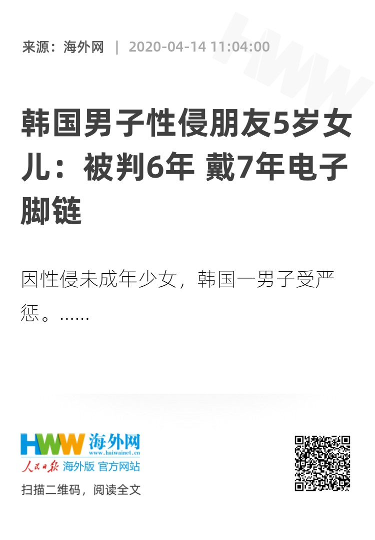 【海外网4月14日编译报道】据韩国YTN新闻报道,韩国大田地方法院13日作出判决,当地一名男子性侵未成年少女的罪名成立,被判6年监禁,须佩戴7年电子脚链,并且10年之内,禁止从事与儿童和青少年相关的工作。