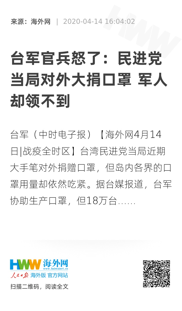 【海外网4月14日|战疫全时区】台湾民进党当局近期大手笔对外捐赠口罩,但岛内各界的口罩用量却依然吃紧。据台媒报道,台军协助生产口罩,但18万台军每日仅配发1.7万片口罩。有负责口罩生产的台军官兵愤怒质疑,民进党当局将口罩送往世界,台军官兵却都领不到。