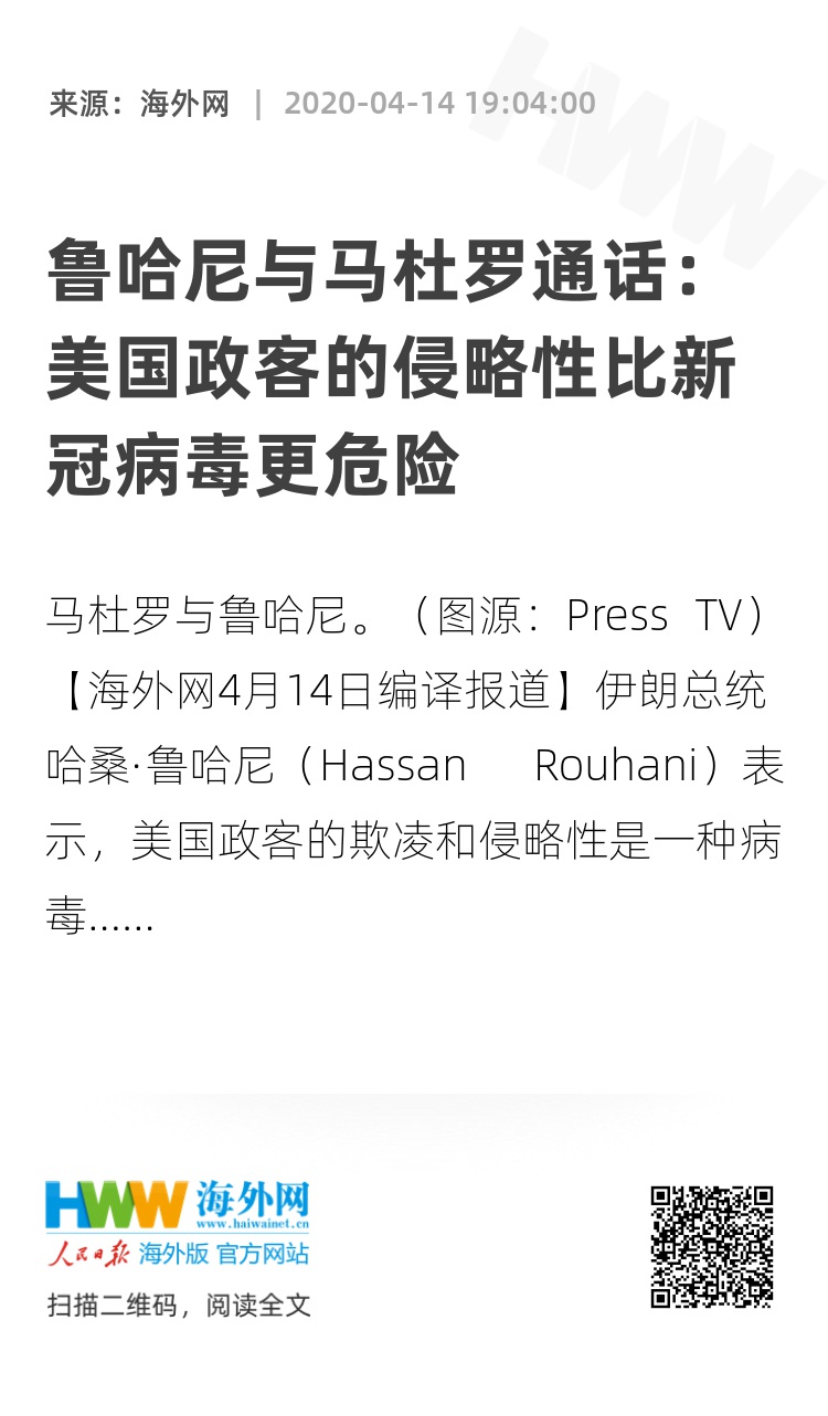 【海外网4月14日编译报道】伊朗总统哈桑·鲁哈尼(Hassan Rouhani)表示,美国政客的欺凌和侵略性是一种病毒,对国际社会来说,它比新型冠状病毒(COVID-19)更“危险”。