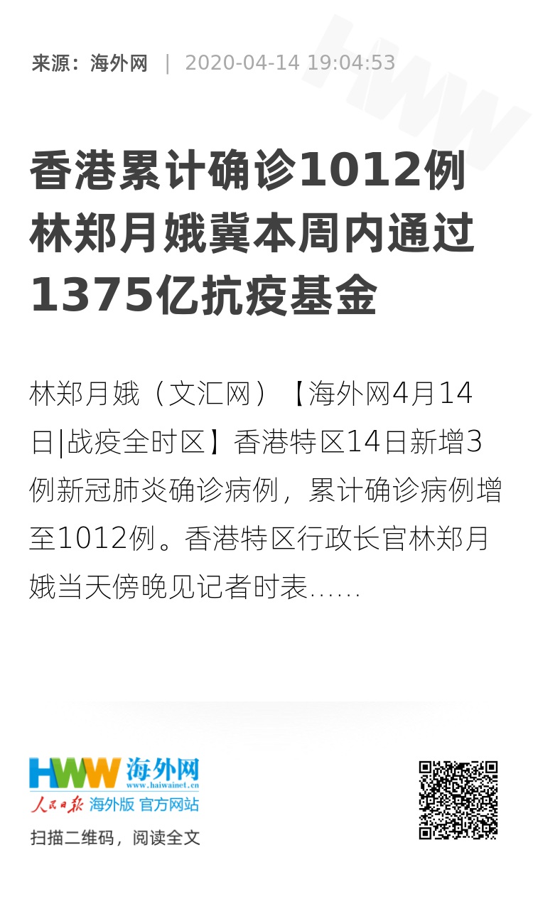 【海外网4月14日|战疫全时区】香港特区14日新增3例新冠肺炎确诊病例,累计确诊病例增至1012例。香港特区行政长官林郑月娥当天傍晚见记者时表示,今日(14日)已向立法会议员发放有关第二轮防疫抗疫基金的文件,涉及1375亿港元(约合1252亿人民币),希望立法会财委会可在周五(17日)审议通过拨款。
