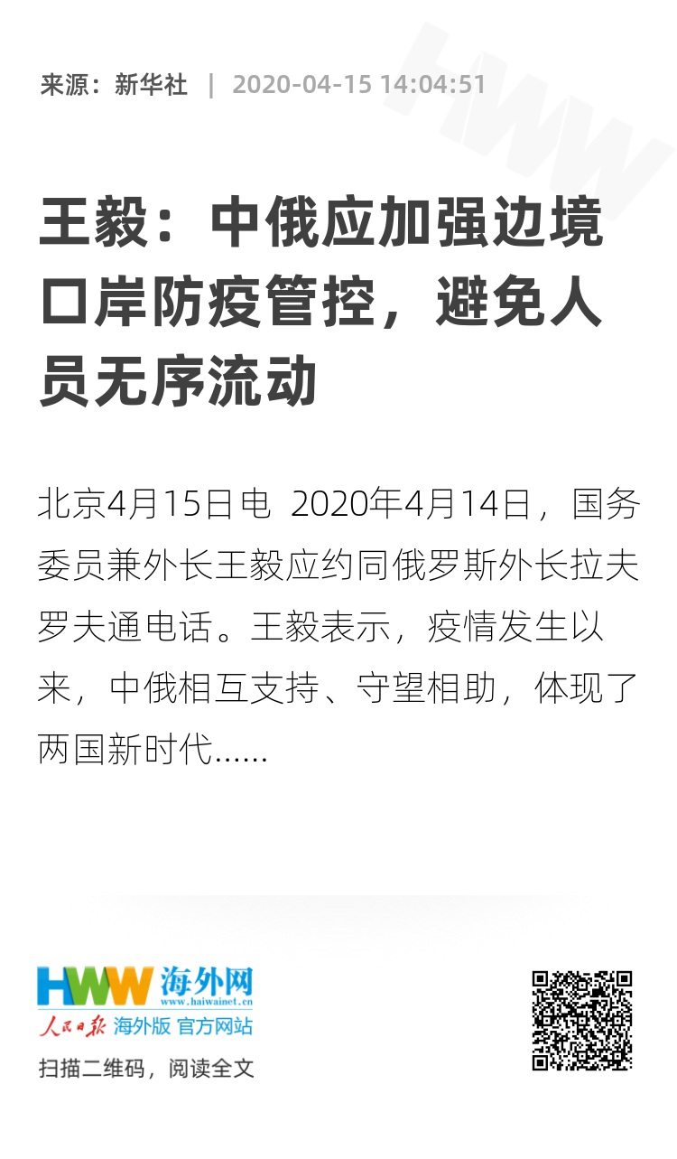 新华社北京4月15日电 2020年4月14日,国务委员兼外长王毅应约同俄罗斯外长拉夫罗夫通电话。