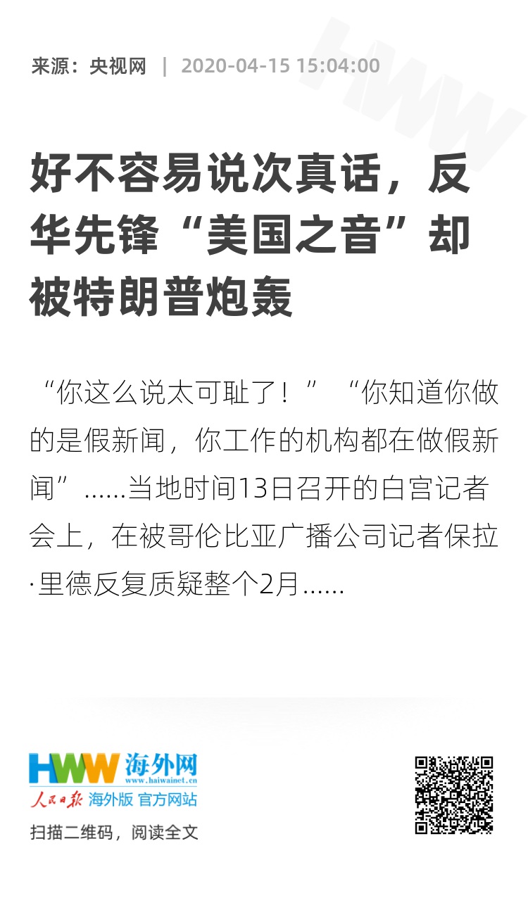 再往前看,在《纽约时报》被批的前两天,白宫罕见地指责“美国之音”花美国纳税人的钱“为中国做宣传”。众所周知,受美国政府资助的“美国之音”是反华先锋,在攻击抹黑中国方面劣迹斑斑。不过,在4月8日武汉“解封”当天,“美国之音”发了篇报道,肯定中国采取武汉“封城”措施是疫情防控成功的“典范”,已被世界许多地方效仿。同时,该报道还转发了武汉“解封”当晚的灯光秀。好不容易讲了次真话,“美国之音”就遭到白宫的口诛笔伐。这不仅兜出了“美国之音”的老底,也让美国政府在所谓言论自由方面的虚伪与“双标”暴露无疑。
