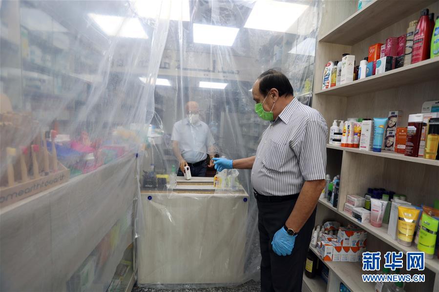 4月14日,在伊拉克巴格达,一家药店挂起塑料薄膜营业。 为遏制新冠疫情蔓延,伊拉克首都巴格达一些药店挂起塑料薄膜,减少与顾客接触。伊拉克卫生部14日报告说,该国在过去24小时内新增确诊病例22例,累计确诊病例1400例,累计治愈766例,累计死亡78例。 新华社发