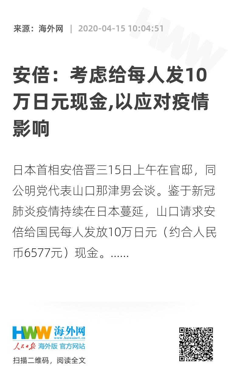 【海外网4月15日|战疫全时区】日本首相安倍晋三15日上午在官邸,同公明党代表山口那津男会谈。鉴于新冠肺炎疫情持续在日本蔓延,山口请求安倍给国民每人发放10万日元(约合人民币6577元)现金。安倍回复“将以此为方向考虑”。
