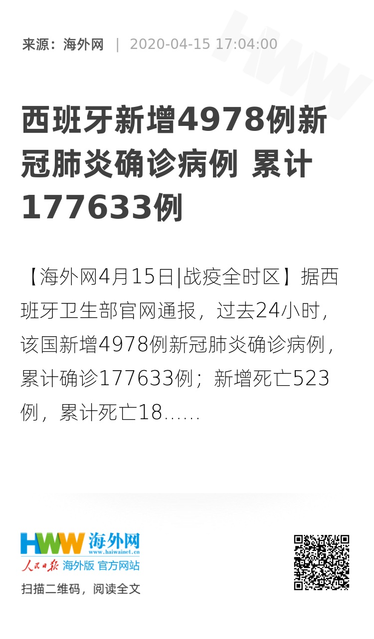 【海外网4月15日|战疫全时区】据西班牙卫生部官网通报,过去24小时,该国新增4978例新冠肺炎确诊病例,累计确诊177633例;新增死亡523例,累计死亡18579例。