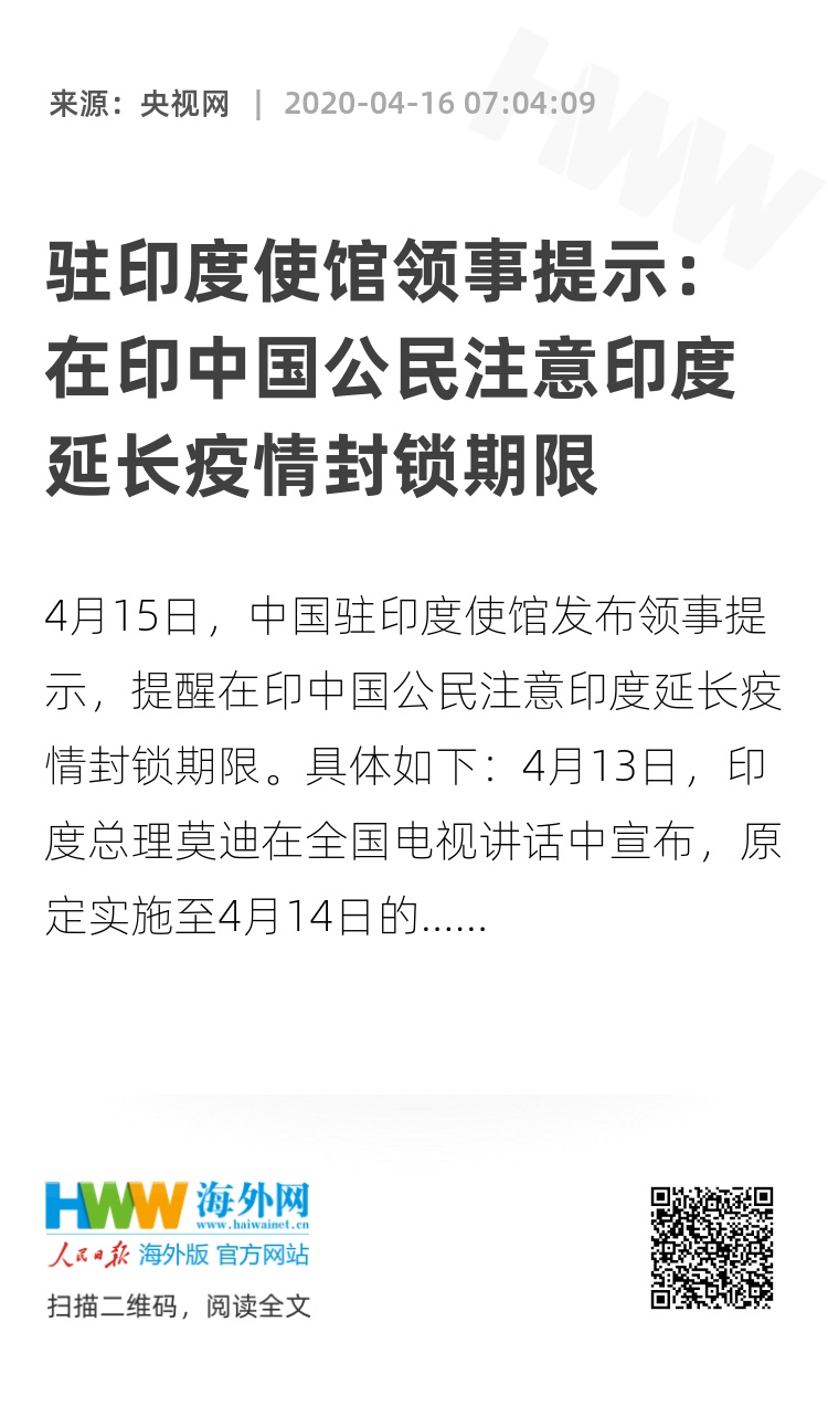 4月15日,中国驻印度使馆发布领事提示,提醒在印中国公民注意印度延长疫情封锁期限。具体如下: