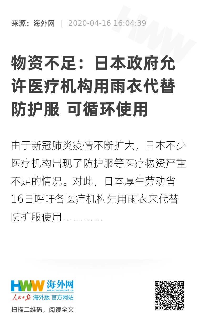 【海外网4月16日|战疫全时区】据日本TBS电视台16日报道,由于新冠肺炎疫情不断扩大,日本不少医疗机构出现了防护服等医疗物资严重不足的情况。对此,日本厚生劳动省16日向全国各自治体发出通知,允许医疗机构用雨衣来代替防护服使用。