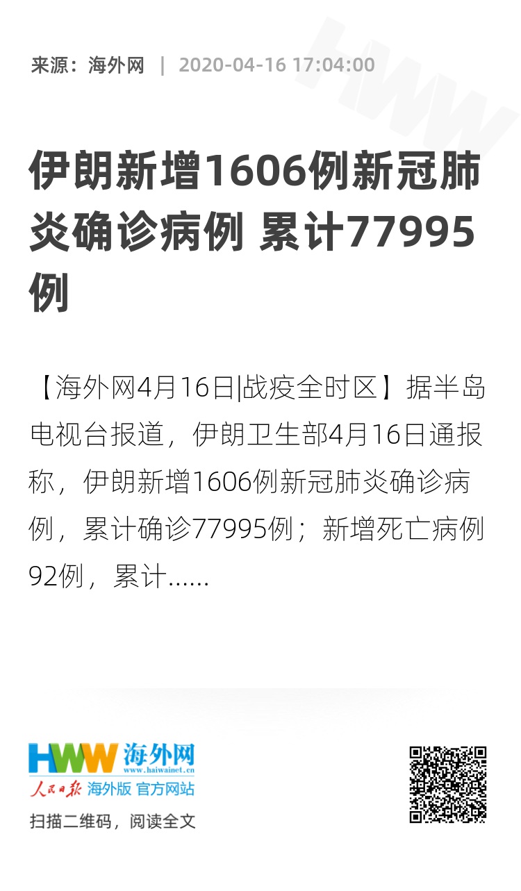 【海外网4月16日|战疫全时区】据半岛电视台报道,伊朗卫生部4月16日通报称,伊朗新增1606例新冠肺炎确诊病例,累计确诊77995例;新增死亡病例92例,累计死亡4869例。16日伊朗单日新增死亡病例是最近一个月内第三次低于100例。
