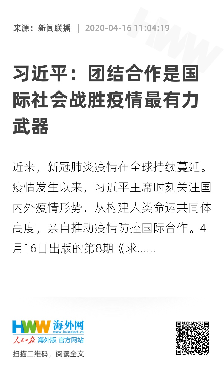 近来,新冠肺炎疫情在全球持续蔓延。疫情发生以来,习近平主席时刻关注国内外疫情形势,从构建人类命运共同体高度,亲自推动疫情防控国际合作。4月16日出版的第8期《求是》杂志将发表习近平的重要文章《团结合作是国际社会战胜疫情最有力武器》。针对疫情防控,习近平多次强调,流行性疾病不分国界和种族,是人类共同的敌人。国际社会只有共同应对,才能战而胜之。