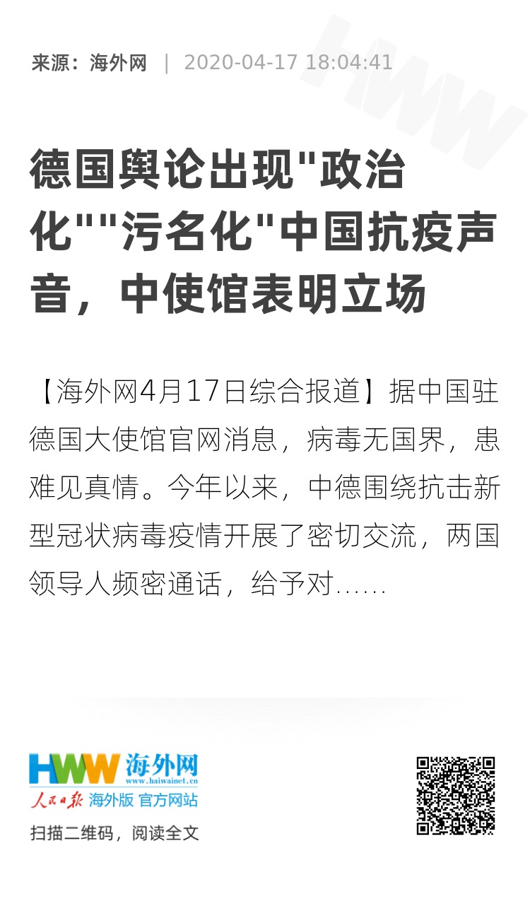 与此同时,我们非常遗憾地看到,德个别媒体出现“政治化”“污名化”中国抗疫的声音,妄称中方促德政界对中国抗疫积极表态进行“政治宣传”,妄言中国分享抗疫经验、驰援他国、呼吁全球携手抗疫是在搞形象宣传。我们想问问这些媒体记者,在中国疫情发生时,德国政府和各界支持中国抗疫,联邦政府向中国提供医疗物资援助,两国专家进行视频交流,德国专家随世卫组织专家组来华考察,也是有地缘政治企图,也在搞政治宣传吗?对我们而言,中方有力的抗疫措施及为此付出的巨大牺牲,得到了中国人民的由衷支持和拥护,这对我们重于一切。我们不需要刻意寻求其他任何赞扬。