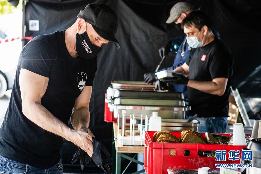 4月16日,在德国首都柏林,一家餐饮公司的工作人员(左)在准备免费发放的食物前戴上手套。 新冠疫情期间,德国不少团体和个人对有需要的群体伸出援助之手。 新华社发(张平摄)