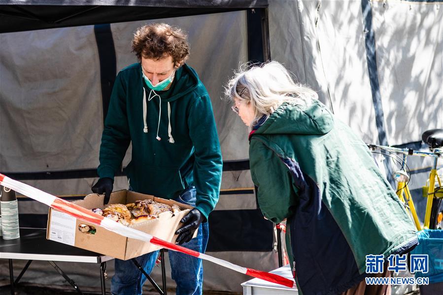 4月16日,在德国首都柏林,一家餐饮公司的工作人员(左)向一名女子介绍免费发放食物的种类。 新冠疫情期间,德国不少团体和个人对有需要的群体伸出援助之手。 新华社发(张平摄)