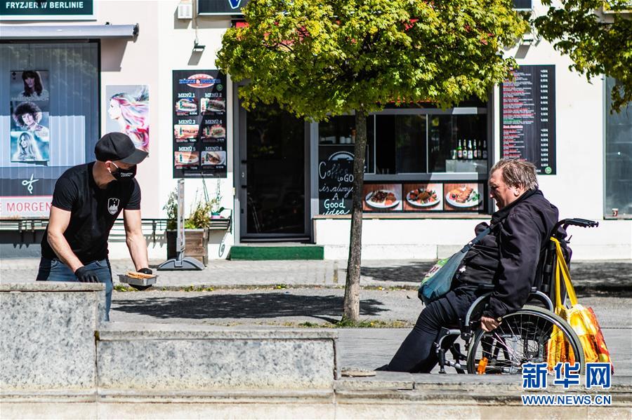 4月16日,在德国首都柏林,一家餐饮公司的工作人员(左)发放免费食物。 新冠疫情期间,德国不少团体和个人对有需要的群体伸出援助之手。 新华社发(张平摄)