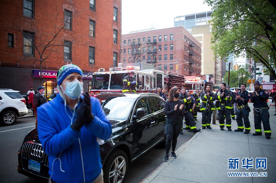 4月16日傍晚,人们聚集在美国纽约一家医院外,向抗击疫情的医护人员表达敬意。 新冠疫情之下,美国纽约民众每晚7点左右自发以鼓掌、喝彩等方式向医护、邮政、公交等“关键行业”人员致敬,感谢他们冒着风险坚持为社会服务。之所以选择每晚7点,是因为医护人员通常在这个时段交接班。 新华社发 (郭克摄)