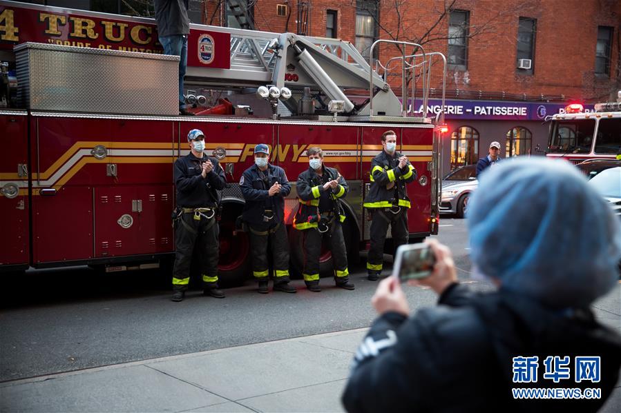 4月16日傍晚,人们聚集在美国纽约一家医院外,向抗击疫情的医护人员表达敬意。 新冠疫情之下,美国纽约民众每晚7点左右自发以鼓掌、喝彩等方式向医护、邮政、公交等“关键行业”人员致敬,感谢他们冒着风险坚持为社会服务。之所以选择每晚7点,是因为医护人员通常在这个时段交接班。 新华社发 (郭克摄)