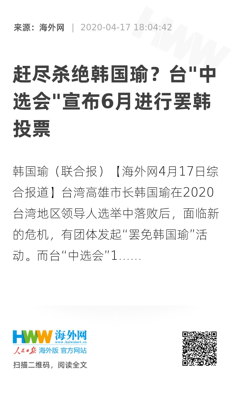 【海外网4月17日综合报道】台湾高雄市长韩国瑜在2020台湾地区领导人选举中落败后,面临新的危机,有团体发起“罢免韩国瑜”活动。而台“中选会”17日下午召开会议,确定“韩国瑜罢免案”成案,罢免投票将在6月6日举行。台网友直呼,这是要对韩国瑜“赶尽杀绝”了。