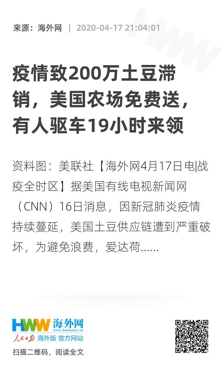 【海外网4月17日电|战疫全时区】据美国有线电视新闻网(CNN)16日消息,因新冠肺炎疫情持续蔓延,美国土豆供应链遭到严重破坏,为避免浪费,爱达荷州一农场免费分发约200万个土豆,先到先得。