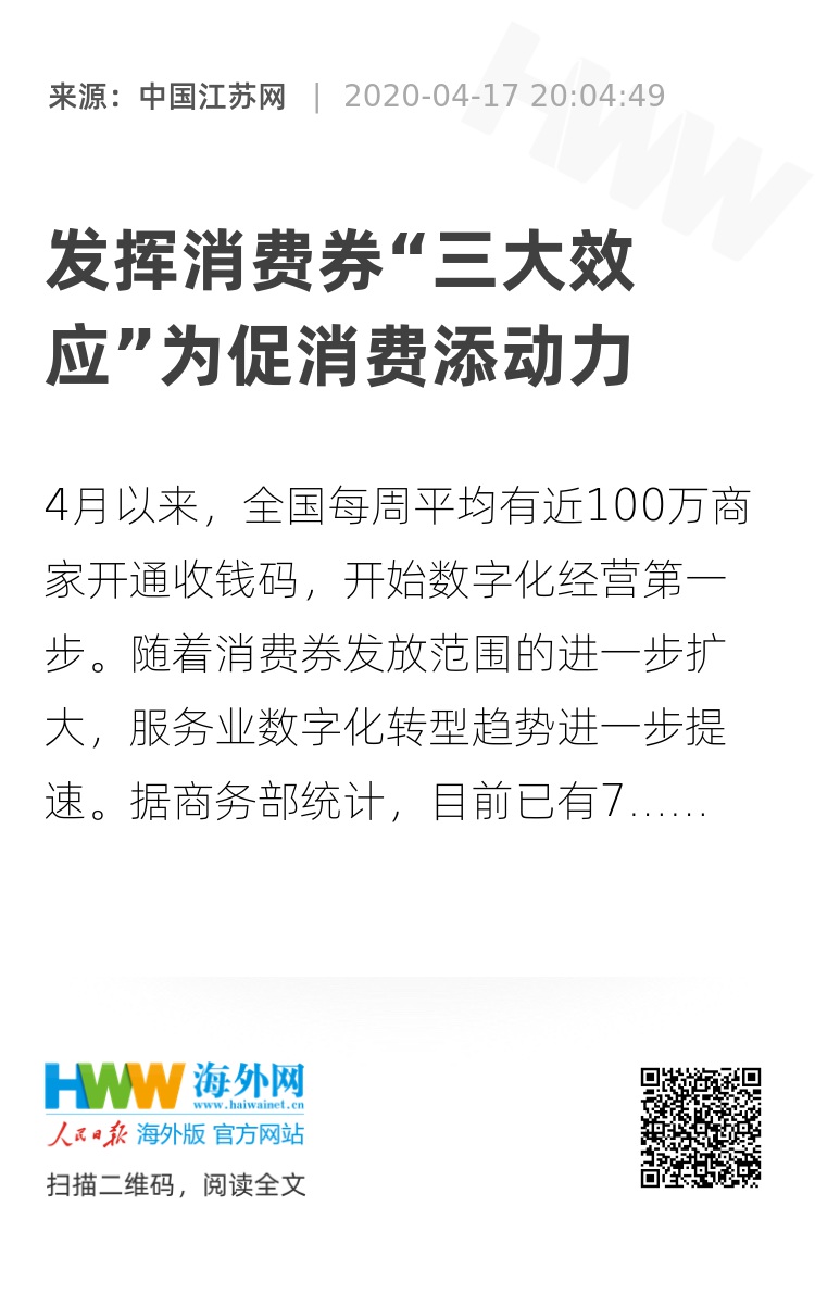 4月以来,全国每周平均有近100万商家开通收钱码,开始数字化经营第一步。随着消费券发放范围的进一步扩大,服务业数字化转型趋势进一步提速。据商务部统计,目前已有7个省超过20个地方宣布发放消费券,总额逾56亿元,这个被视为“真金白银”的及时措施,有效提振了居民消费的信心,在恢复生产生活秩序的过程中发挥了重要作用。