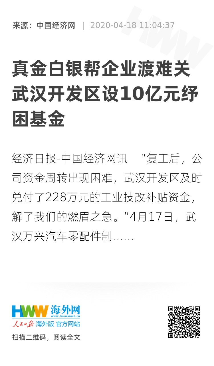 经济日报-中国经济网讯 “复工后,公司资金周转出现困难,武汉开发区及时兑付了228万元的工业技改补贴资金,解了我们的燃眉之急。”4月17日,武汉万兴汽车零配件制造有限公司人事财务部长胡文彬表示,疫情期间,政府不但拿出真金白银,还出台一批惠企政策为企业纾困,增强企业发展信心。