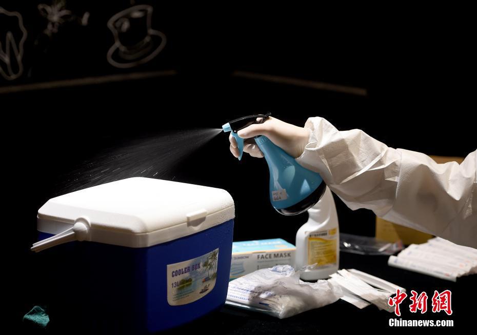 在样本转运交接前,采样人员对带有UN2814标识的A类标本运输箱进行酒精外消毒。中新社记者 侯宇 摄