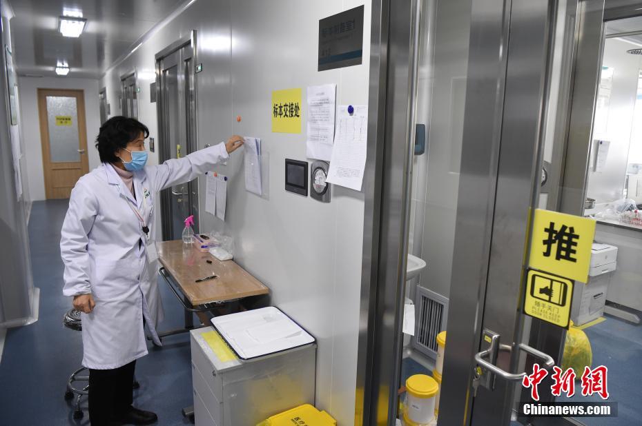 实验室实验诊断部陈宝荣总监在标本交接处介绍标本交接流程。中新社记者 侯宇 摄