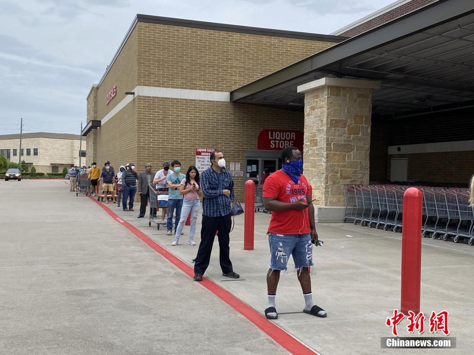 当地时间4月18日,美国休斯敦民众在当地一大型超市外排队等候入店采购。排队人群保持着社交距离。为防范新冠病毒的传播,美国多家超市于4月4日起采取了顾客限流措施,保证店内人与人之间能有6英尺的社交距离。中新社记者 曾静宁 摄