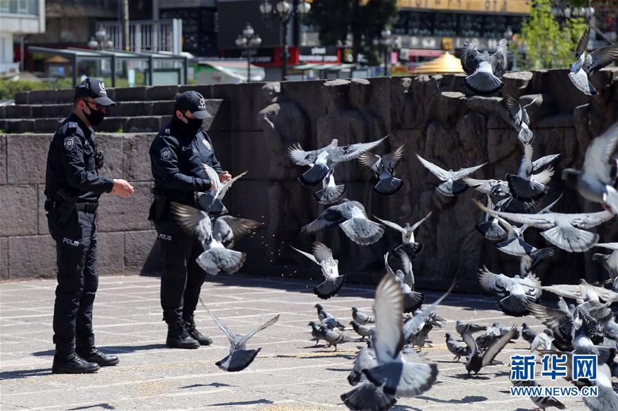 4月18日,在土耳其安卡拉,警察给鸽子喂食。新华社发(穆斯塔法·卡亚摄)