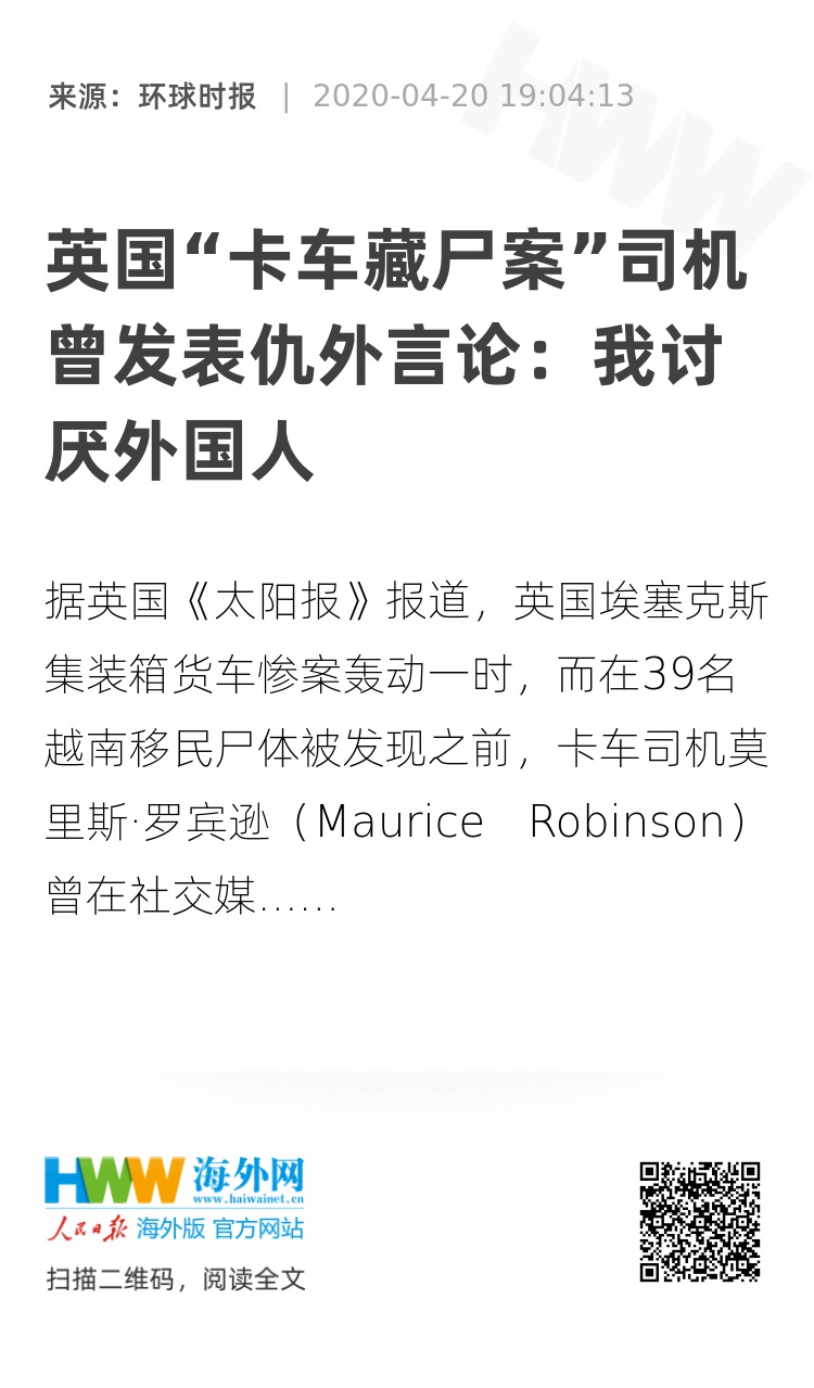 据英国《太阳报》报道,英国埃塞克斯集装箱货车惨案轰动一时,而在39名越南移民尸体被发现之前,卡车司机莫里斯·罗宾逊(Maurice Robinson)曾在社交媒体上表示“我讨厌外国人”。