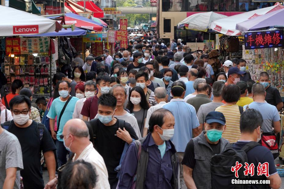 4月19日,在香港深水埗商铺林立的街道上挤满了人群,众多戴口罩市民趁星期天前来购物。当天,香港卫生署卫生防护中心通报,香港当日新增2宗新冠肺炎确诊病例,一宗为输入病例、一宗为本地病例。这是香港连续第8天新增病例为个位数。至今,香港累计报告新冠肺炎确诊病例增至1025例。专家多次呼吁,尽管新增病例持续回落,但仍不可掉以轻心。中新社记者 张炜 摄