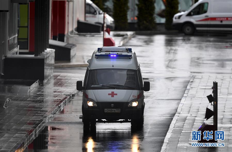 这是4月19日在位于俄罗斯首都莫斯科市郊科穆纳尔卡的医院附近拍摄的救护车。 新华社/卫星社