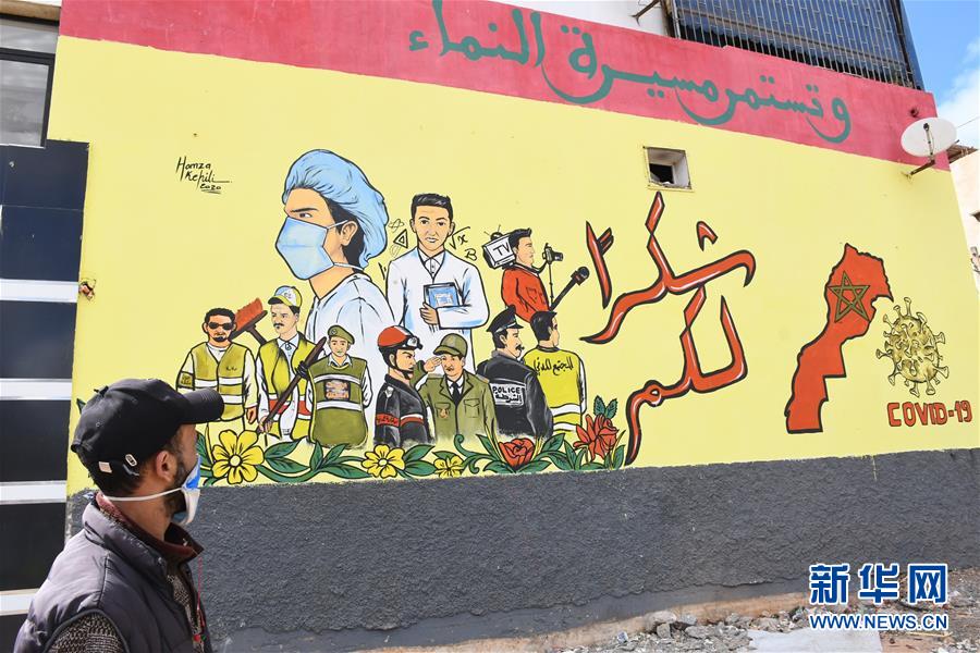 4月19日,在摩洛哥塞拉,一名男子走过一幅向疫情期间辛苦付出的人们致谢的宣传画。摩洛哥政府18日宣布,考虑到新冠疫情的蔓延,全国公共卫生紧急状态将延长一个月至5月20日。新华社发(查迪摄)